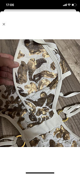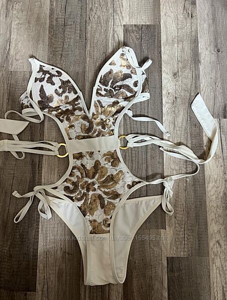 Очень красивый белый купальник , расшитый мелкими золотистыми паетками. Паетки совсем не яркие и не броские. На плотных поролоновых чашках. Бренд Ann Summers. Купальник в идеальном состоянии, без следов носки. Надевался один раз, не подошёл по размеру.Размер 46.