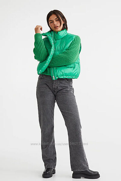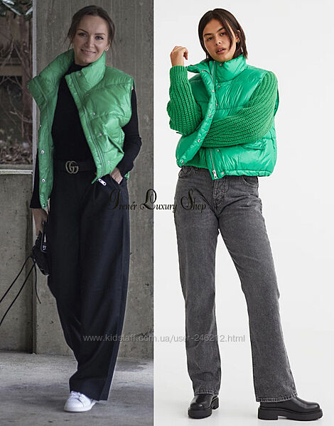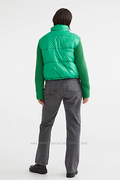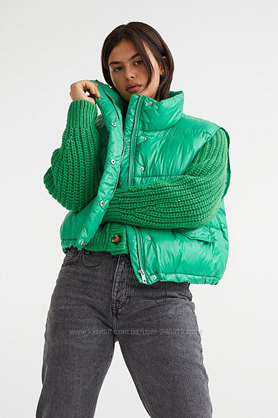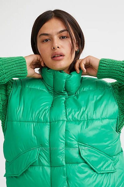 Стеганий крутий жилет пуффер H&M шикарного зеленого соковитого кольору.Легенький та оверсайз фасон з високим коміром-стійкою, блискавкою та вітрозахисною планкою на кнопках спереду та злегка приспущеними плечима. Передні кишені з клапаном на кнопці та еластична куліска внизу для регульованої посадки. Підкладка.