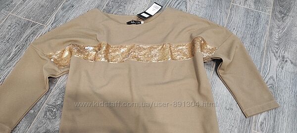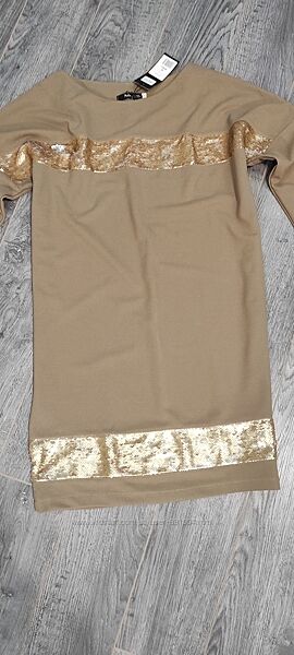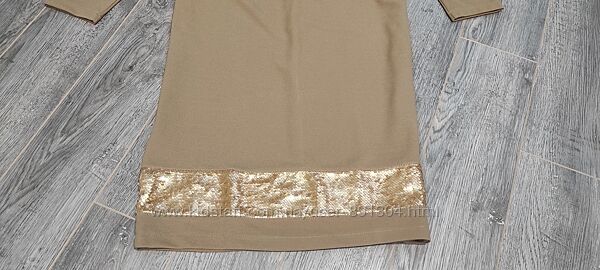Лаконичное платье прямого кроя с вставками из мерцающих пайеток. Изделие со спущенной линией плеча - придаёт объем в области груди. Без застежек. Материал:Креп-дайвинг.