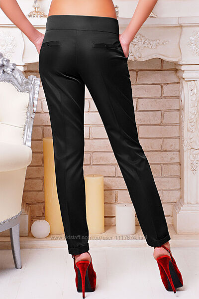 Жіночі класичні штани. Фасон прямий, забезпечує комфорт у носінні та гарний зовнішній вигляд. По центру штанини попереду та ззаду проходять стрілки. Низ оформлений невеликими підворотами. З обох боків знаходяться прорізні кишені з діагональним входом. Застібка широкого поясу проходить через шльовку. Розташовані ззаду кишенькові клапани декоровані ґудзиками.