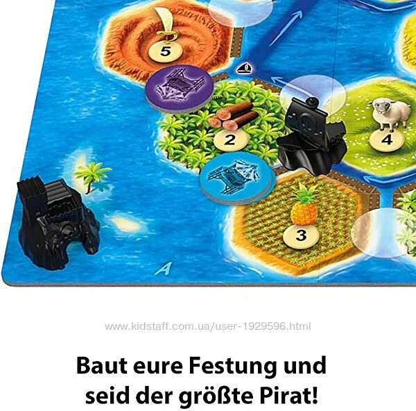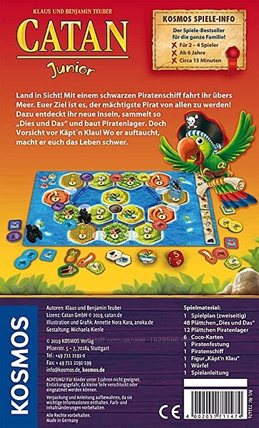 Путешествуйте по морям на своем пиратском корабле и станьте самым могущественным пиратом из всех! Открывайте новые острова, стройте пиратские лагеря и находите важные источники сырья. Чем больше сырья, тем больше богатство. Но остерегайтесь капитана Клау! Где бы он ни появлялся, он усложняет вашу пиратскую жизнь. Благодаря упрощенным правилам обмена и удобным для детей тем и другим плиткам, даже самым маленьким поклонникам CATAN будет очень весело играть. Теперь и в дороге в практичном маленьком формате, который можно взять с собой.Время игры: около 15 минут