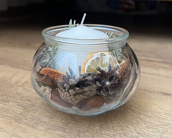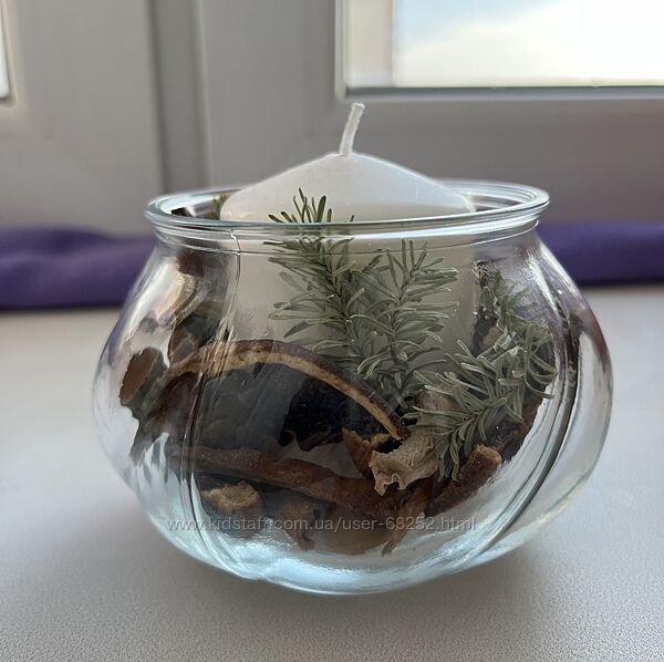 Подробное описание: Декорована новорічна біла свічка у скляному вазоні Ікеа.