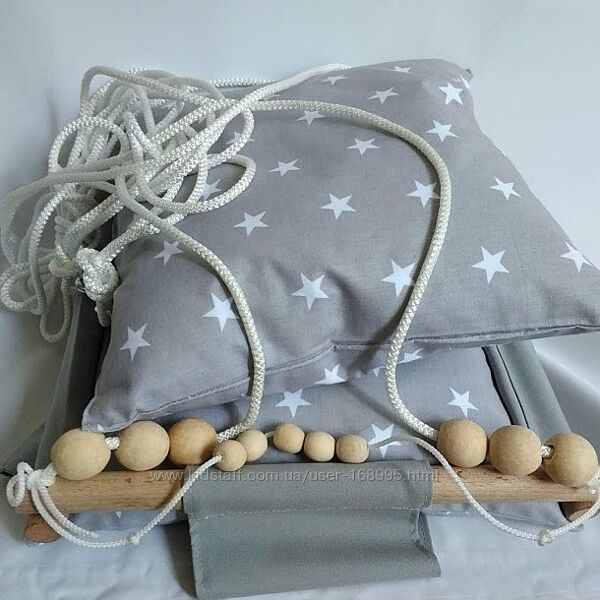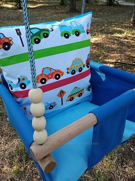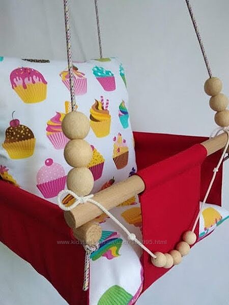 Качели сделаны из екологичных материалов, ткань для качели плотная, обладает водонепроницаемыми и грязеотталкивающими свойствами. Хлопковая, приятная на ощупь, дышащая, в 2 слоя