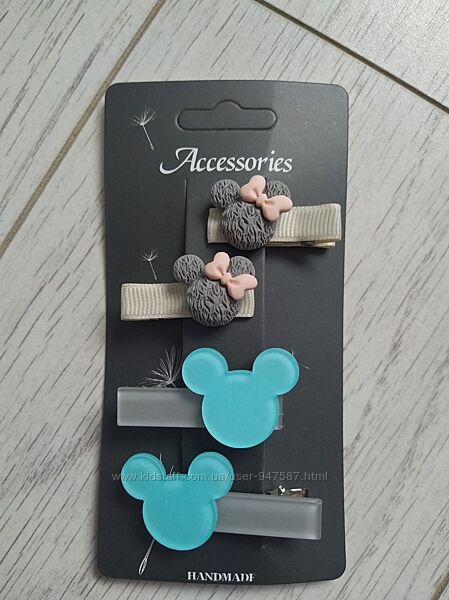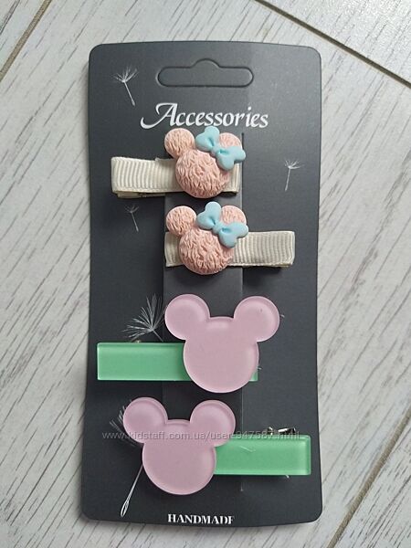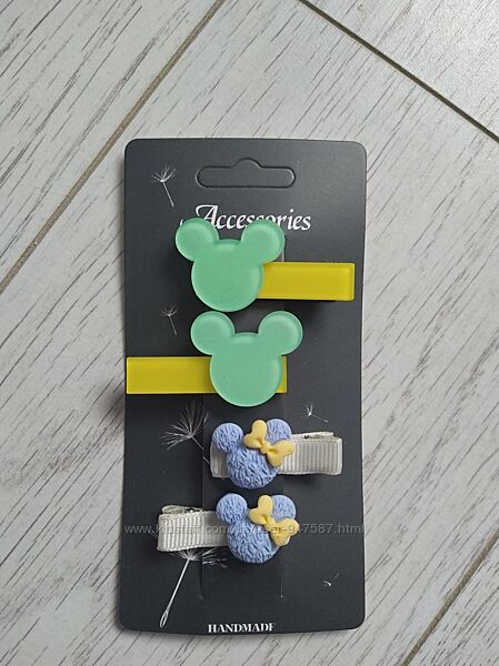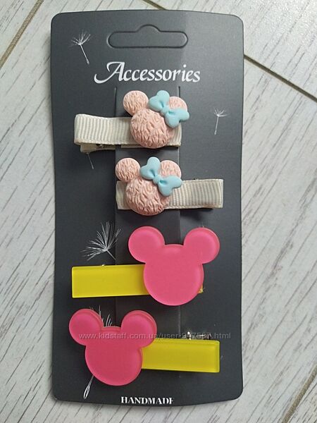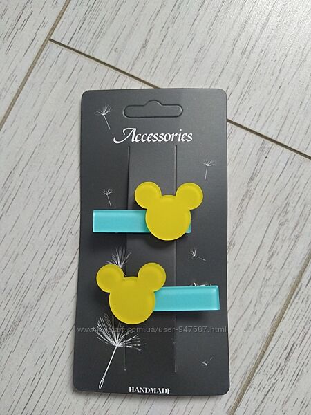 Набор парных заколок с микки-маусом, маленькие на бежевой тканевой основе (длина 3,5 см) и немного по-больше из яркого акрила (длина- 4 см),1 пара-55 грн на выбор,