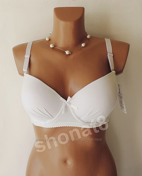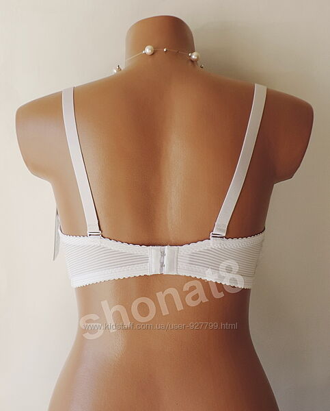 Бюстгальтер с очень красивыми ажурными вставками, пошит из мягкой ткани в полосочку. Очень красиво смотрится. Чашки бюстгальтера на тонком формованном поролоне. Форма чашек классическая, удобная. Бретели съемные, регулируются по длине. Застежка сзади на два металлических крючка. Бюстгальтер украшен атласным бантиком.Размер чашки: D