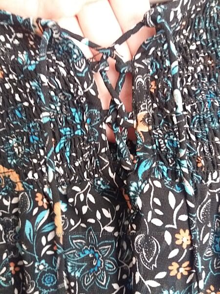 Гарна блуза з квітами від New Look. Розмір вказано UK 10. Заміри: плечі 35 див, довжина рукава 60см., пог 51см.(може бути більше за рахунок "зібраної" тканини), пос 60см., довжина 61см.(спереді) і 69см.(позаду).Повернення немає.