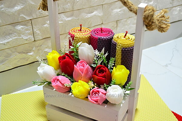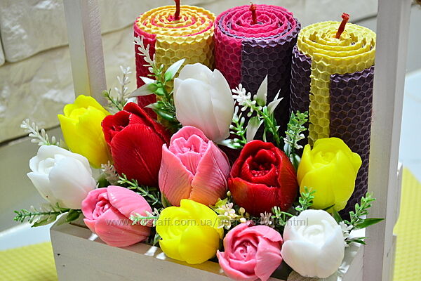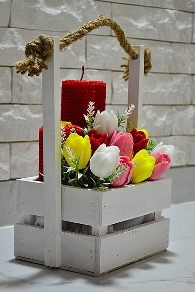 Тюльпаны из мыла ручной работы в деревянной корзинке к 8 марта