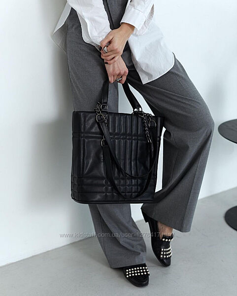 Сумка имеет два комплекта ручек, что позволяет носить сумку в руке, на сгибе локтя и на плече .