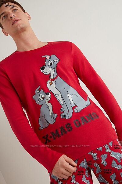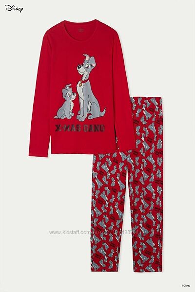 Tezenis — итальянский бренд мужского, женского и детского нижнего белья. Торговая марка принадлежит группе компаний Calzedonia GroupДлинная пижама из плотного хлопка. Топ с круглым вырезом с принтом Disney Tramp и брюки с принтом по всей поверхности на красном фоне.