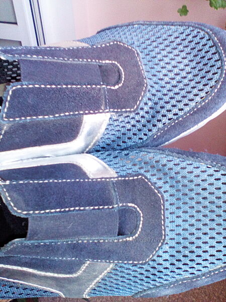 Лёгкие , дышащие, с прочной сеткой, кожаная стелька и верх. Стелька 25 см Верх серебристого цвета кожа и синий замш Состояние - носилось пару раз, Сделано в Пакистане