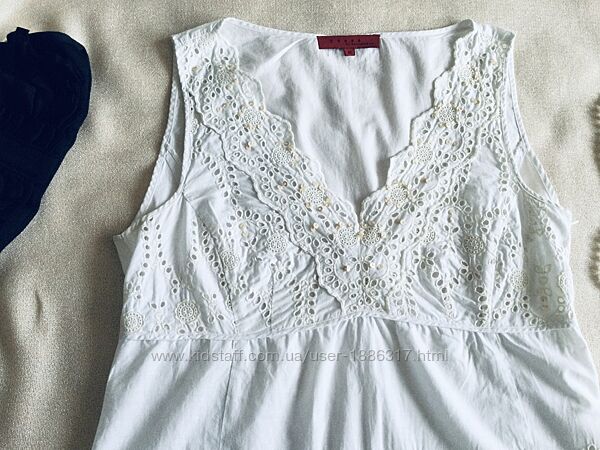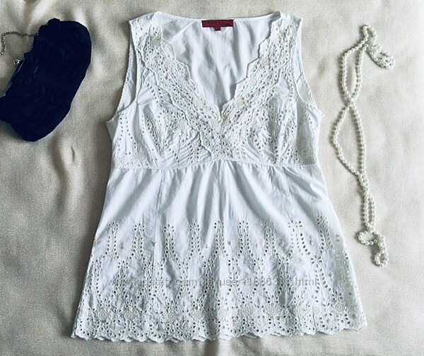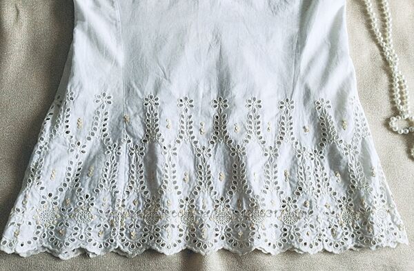 DONNA. Блуза из прошвы. Женственная модель. Сбоку на молнии. Состояние идеальное. Длина 66; подмышки 49 Прошва сама по себе красива, поэтому такая ткань не нуждается в обрамлении какими-либо деталями. Огромную популярность в этом сезоне получила белая прошва, одежда из которой выглядит изысканно и очень нарядно. Прошва - Легкая и тонкая ткань изготавливается по большей части из натуральных волокон. Хлопчатобумажная материя отличается фактурностью, приятна к телу, не вызывает аллергической реакции и раздражения. Носить могут даже девушки с чувствительной кожей. цветочные мотивы перфорация – мелкие дырочки, обработанные обметочным швом и расположенные по поверхности узора.Другие объявления продавца
