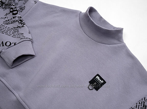 Стильный утеплённый трикотажный костюм для девочки.Модный, стильный костюм с газетным принтом для девочки, приятного серовато-лавандового цвета в стиле «спортивный шик»: