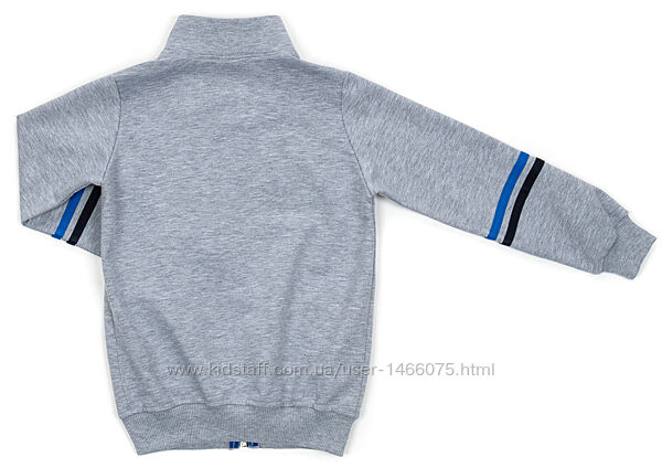 Украшен принтовыми рисунками и контрастными трикотажными полосками на рукавах олимпийки.