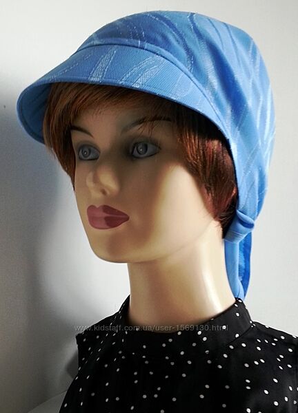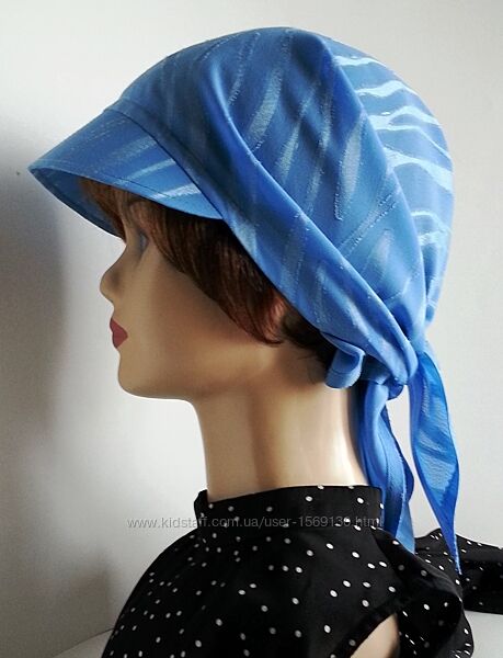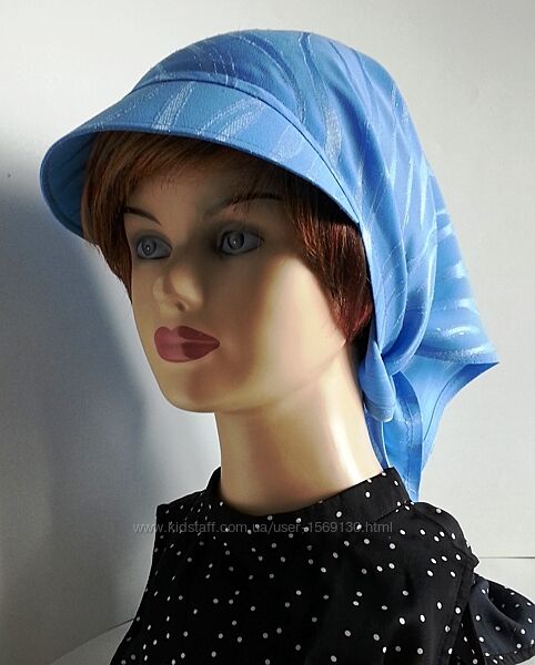 Бандана выполнена из креп - жоржета бледно - василькового цвета с атласными полосами. Ткань смотрится очень нарядно. В этой бандане - косынке можно даже пойти в Храм, на Крещение.