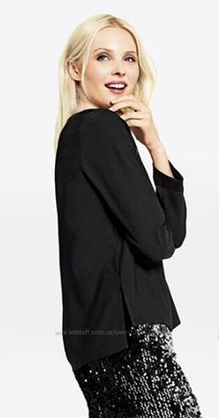 Шикарная черная блуза от Esmara Германия. отличный вариант для офиса, а также на выход. По вороту и на манжетах атласные вставки. Блуза не тянется. Размер евро 34 . Замеры: длина 56см/63см рукав 60см плечи 37см ширина под мышками 46см Есть нюанс: на одном из манжетов зацепка ( на последнем фото ). 100% полиэстр.