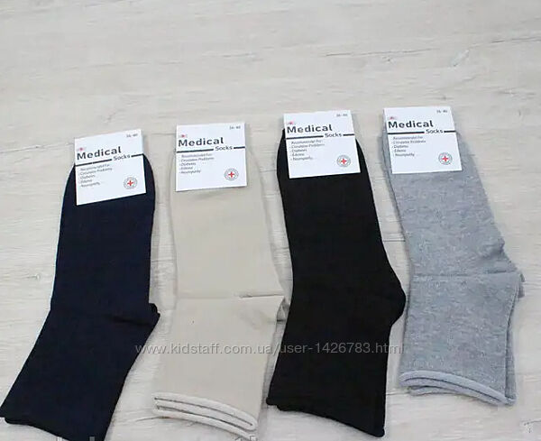 Призначені для людей, які мають варикозне розширення вен або набряклість ніг. Відсутність гумки не впливає на функціональність носіння шкарпеток, вони точно так само, як звичайні шкарпетки облягають і тримаються на ніжці, але не залишають слід від гумки. Характеристики шкарпеток Medical середніх: склад: 90% бавовна, 10% лайкра; розмір: 36-40; колір: чорний, зелений, сірий, темно-синій; країна-виробник: Туреччина.