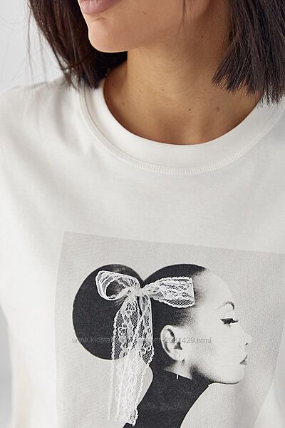 Футболка з мереживним бантом – стильний елемент гардероба.Має вільний крій, що забезпечує зручність у носінні, та прямий низ, який додає універсальності.