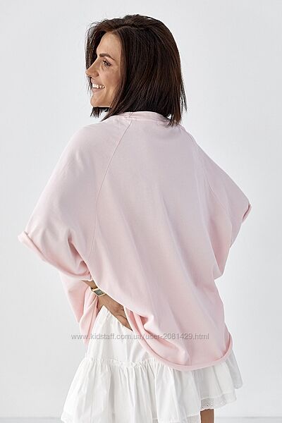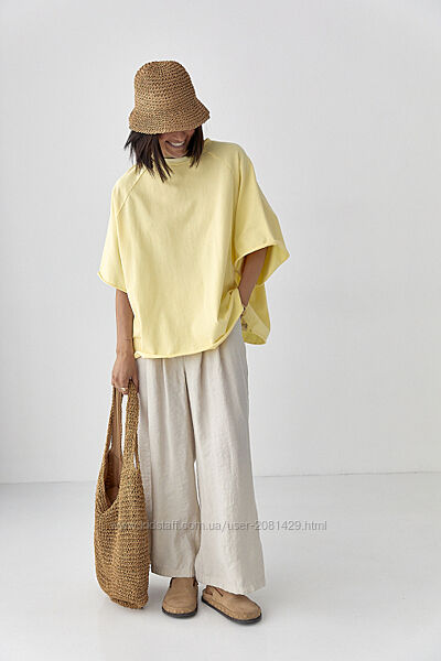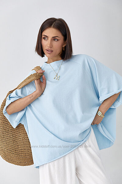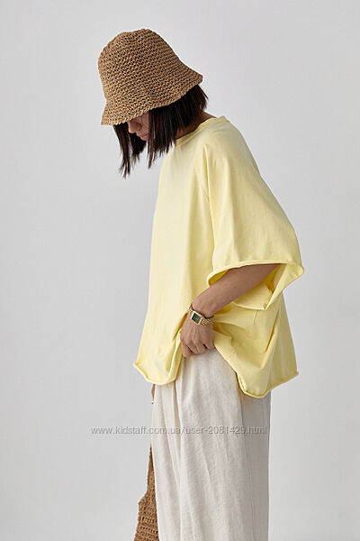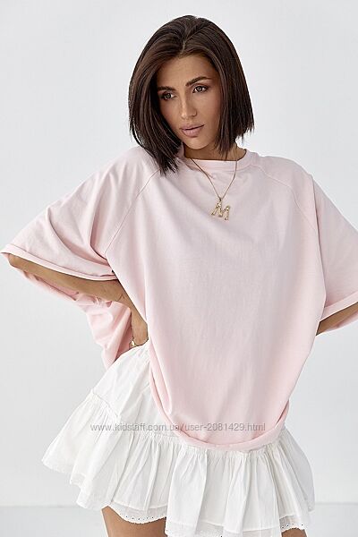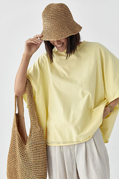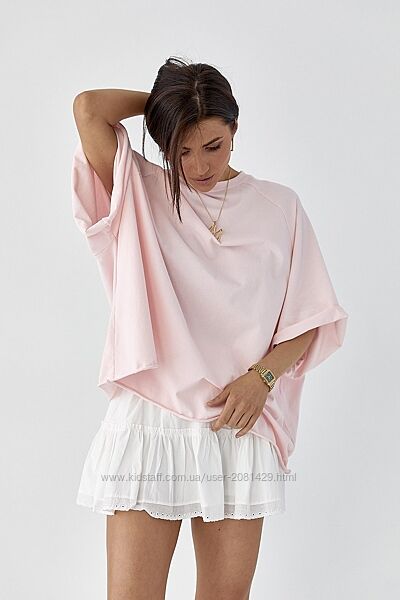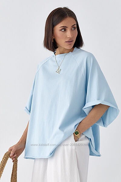 Футболка оверсайз із рукавами-реглан.Широкий прямий крій створює вільний силует, який ідеально підходить для розслаблених, сучасних образів. Низ необроблений.