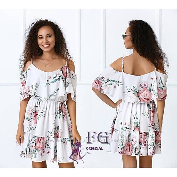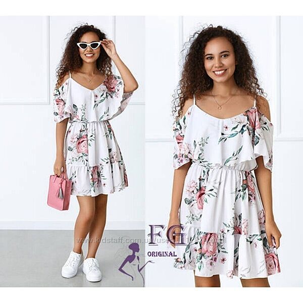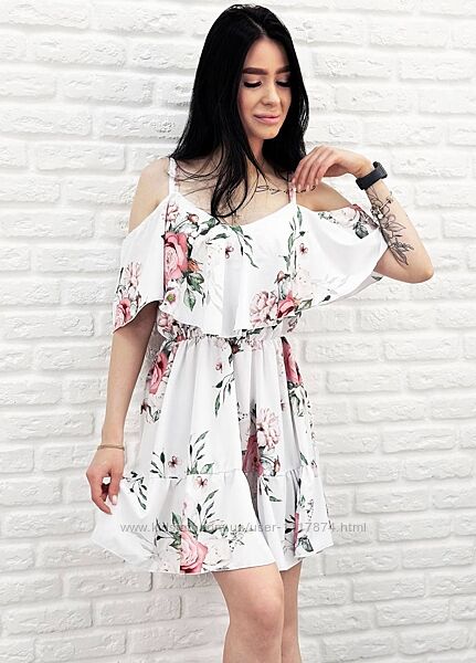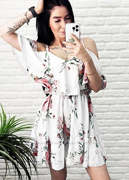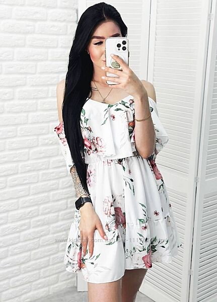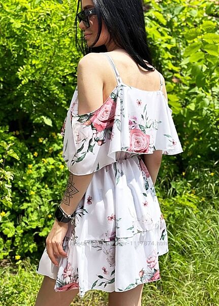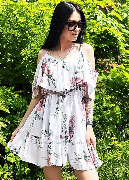 Цей літній сарафан з відкритими плечима та воланами безперечно перетворить будь-яку жінку на спокусливу кокетку! А неймовірно красивий квітковий принт підкреслить жіночність образу, надавши йому легкої та урочистої свіжості.