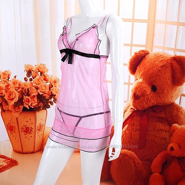 Стильний спокусливий пенюар. Виконаний із тактильно приємного напівпрозорого матеріалу (сіточка). Бюст - прикращений чорним бантом та рюшами, без підкладок та вставок. Бретелі регулюються. Модель класичного крою. Трусики-стрінги в тон в комплекті.Розмір - XXS, XS, S, M, L
