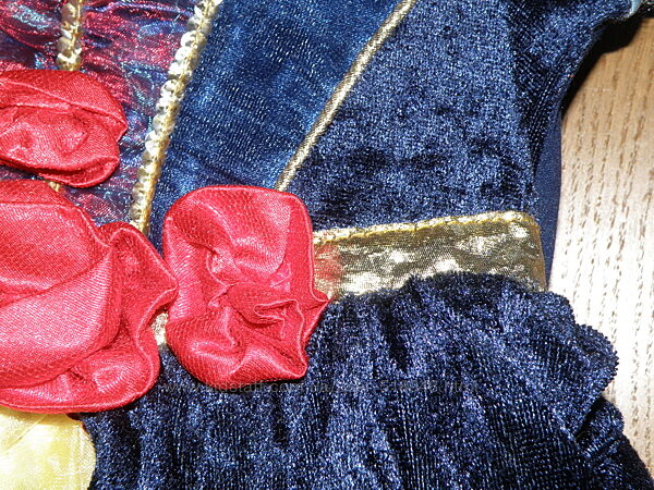 Общее состояние хорошее, есть нюансы, которые незаметны при ношении - подшит золотистый пояс и нижний край юбки, подправлено красным лаком осыпанное красное покрытие (рукава гладить с изнанки!).