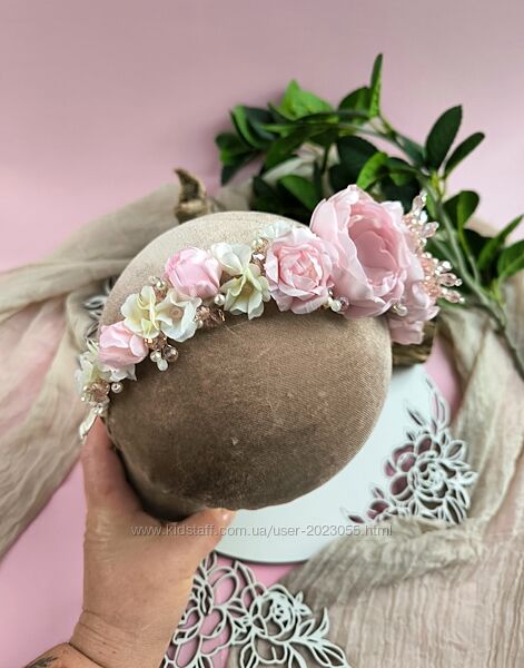В наявності!Обруч з короною та квітами з тканини! Дуже нарядний та ніжний!!!!