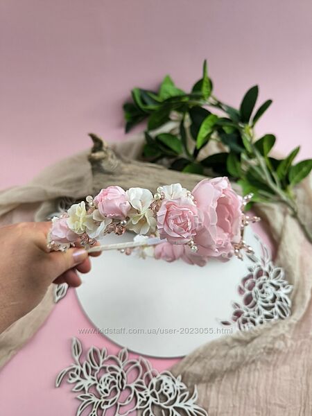 Колір пудрово-рожеві квіти та молочні!!! Квіточки прикрашені кришталевими перлинками.