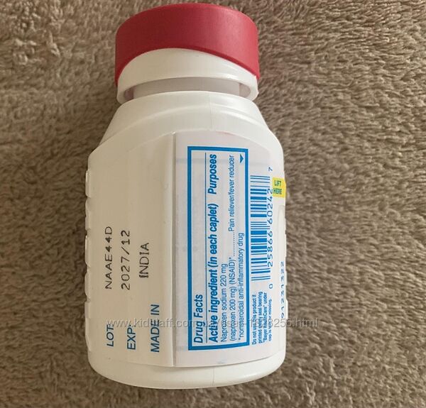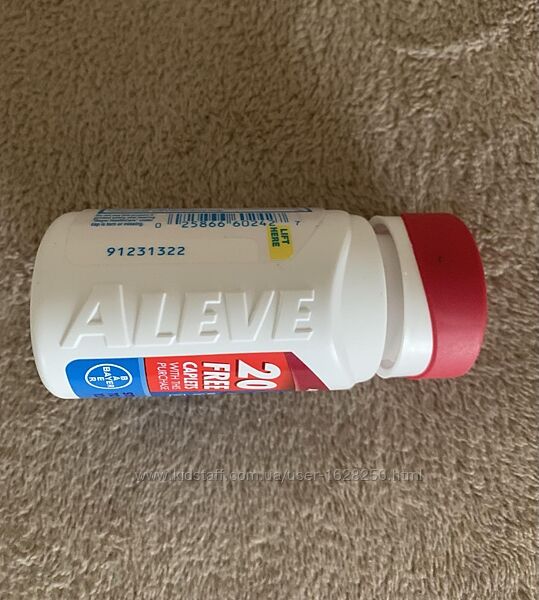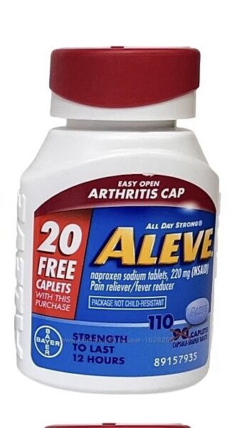 Aleve фірма Bayer 220 mg 110 каплет, куплено в США – діюча речовина Напроксен* (Naproxen*) - це безрецептурний (OTC) нестероїдний протизапальний, знеболювальний препарат (НПЗП).Aleve забезпечує тимчасове полегшення незначних болів і болів через: