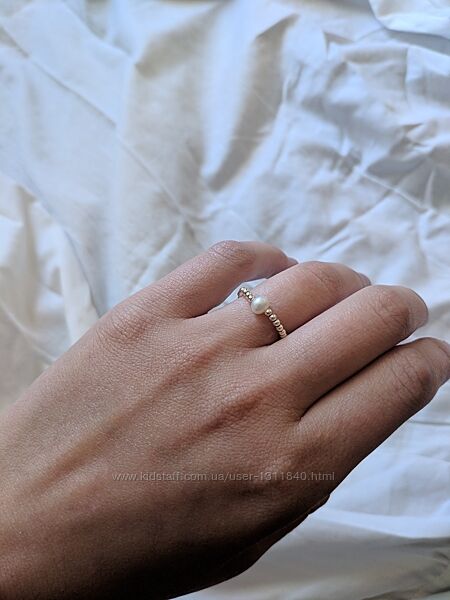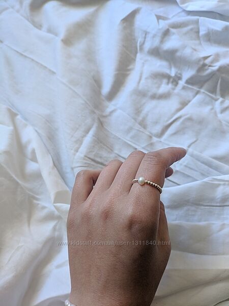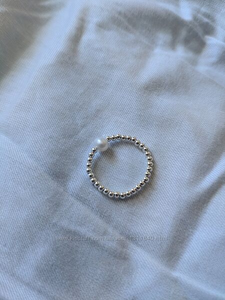 Витончене кільце з маленькими посрібленими намистинками в мінімалістичному стилі. Ніжно та стильно виглядає на пальчику. Намистинки нанизані на волосінь, яка тягнеться, але не сильно.Намистинка посередині виконана з прісноводних перлів. Розмір перлин 4-4,5 мм. Перлина біла, але має невеликий перламутровий відлив на світлі. Намистинки виконані зі срібла 925 проби, каблучка легка, так як кульки всередині пусті.