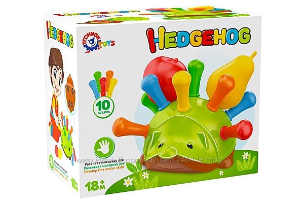 На спинці їжачка є 10 спеціальних отворів. Завдання малюка - вставити у них кольорові "голки". Здавалось би проста, на перший погляд гра, дуже добре розвиває дрібну моторику пальчиків. Велике яблучко та грушка поміщаються між голками, що приносить додатковий ігровий момент. Тепер "Їжачок", як справжній лісовий чарівник.