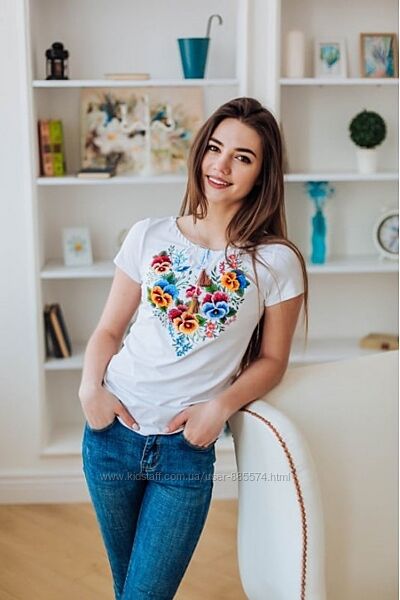 Жіноча вишита футболкаПрикрашена квітковим орнаментом на білому, чудово підкреслює Ваш неперервний смак і стиль.