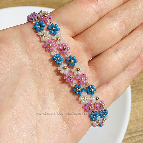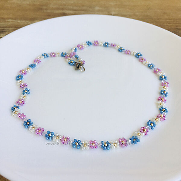 Яркий бисерный чокер с цветочным узором в голубом, розовом и бежевых цветах. Изготовлен из чешского бисера с фурнитурой из нержавеющей стали.Длина чокера - 43 см