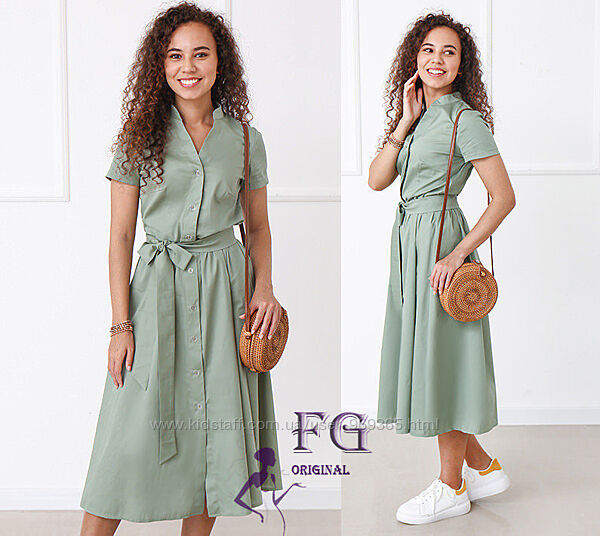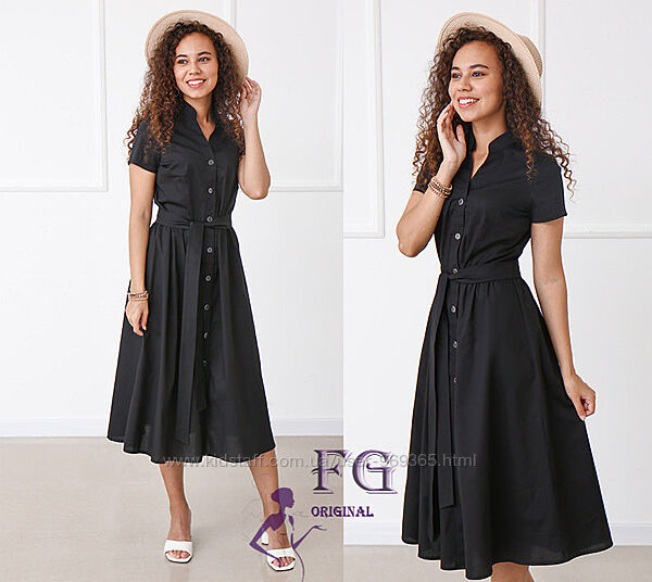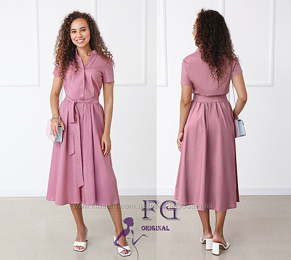 Платье с короткими рукавами на пуговицах имеет полуприталенный верх, отрезную талию и свободную юбку длины миди. В комплекте есть съемный поясок, с помощью которого можно акцентировать талию.