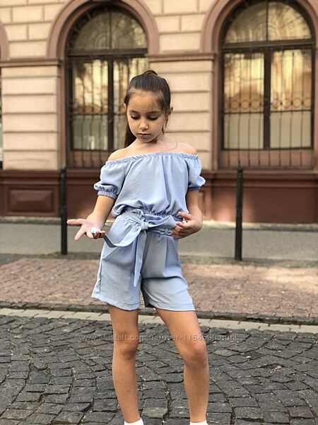 Літній костюм на дівчинку блакитного кольору . Тканина американський креп, легка та приємна у спеку. Шорти мають кишені. У комплекті йде поясок.Заміри: