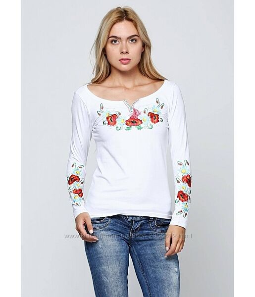 Футболка виготовлена з бавовняної тканини білого кольору. Довжина рукава три чверті. На грудях і на рукавах оздоблена вишитими маками. Кольори вишивки червоний, зелений, чорний, жовтий, голубий.Розміри: M, L, LX
