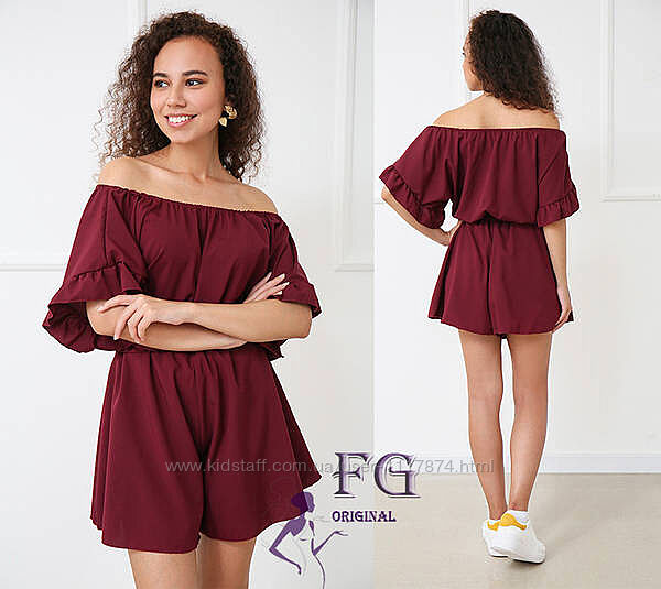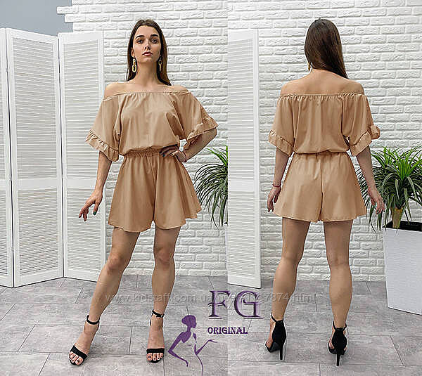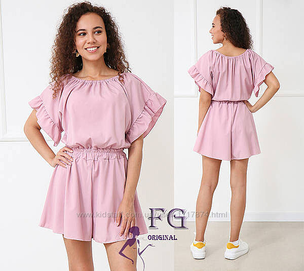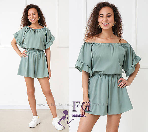 Комбинезон с шортами пошит из легкой ткани софт. Наряд можно носить в разных вариациях – с одним открытым плечом, а можно оголить или закрыть оба плеча. С помощью вшитой в пояс резинки, очень хорошо акцентируется талия. Изюминка изделия – кокетливые оборочки на рукавах, что придают образу легкости.
