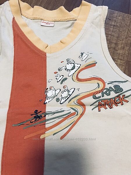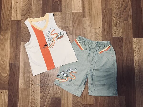 летний комплект, майка-борцовка шорты-бермуды в идеальном состоянии. На бирке указан рост 110 см , ориентируйтесь по замерам. На лето будет отлично-не жаркий, 100% хлопок. Покупали в Антошке.Майка