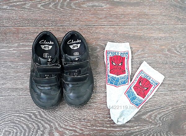 В подарок ботинки Clarks, размер 29,5. Длина о стельке 19,2 см и носочки Marvel с Spiderman.