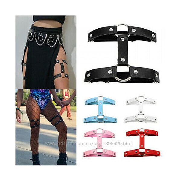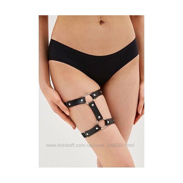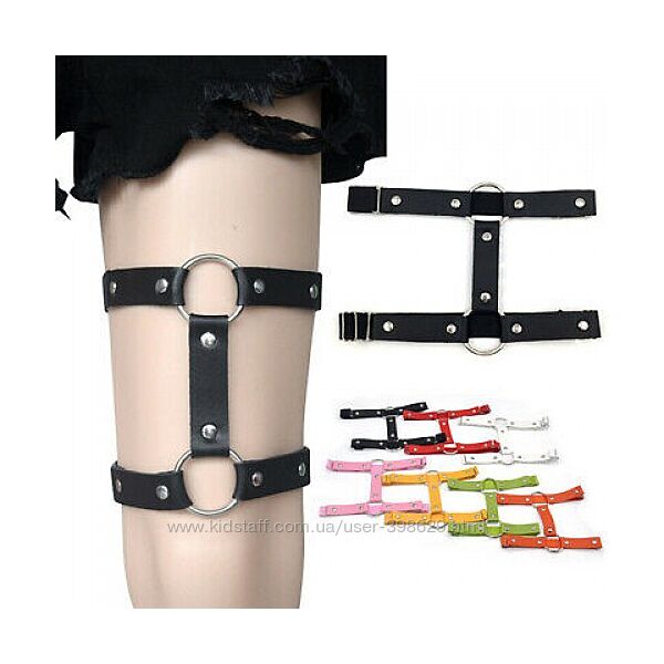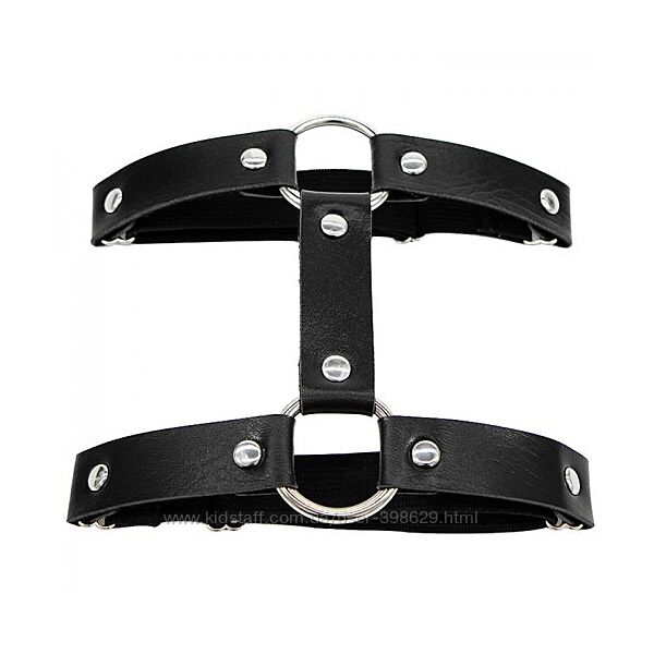 Эффектная подвязка выполнена из мягкой кожи и декорирована металлическими заклепками и двумя металлическими кольцами. Фиксируется на ноге с помощью трех резинок, длина которых дополнительно регулируется специальными пряжками. Подходит для любого обхвата ноги.