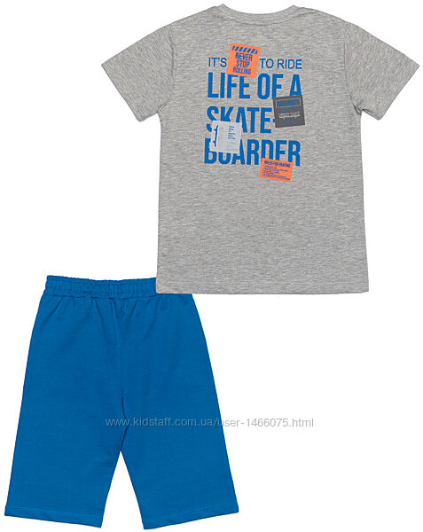 Стильный летний комплект c шортами для мальчика «NO LIMITS».Замечательный летний комплект отличного качества для юного скейтбордиста: меланжевая серая футболка и светло-синие шорты-бермуды.