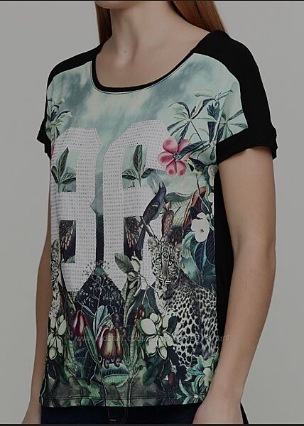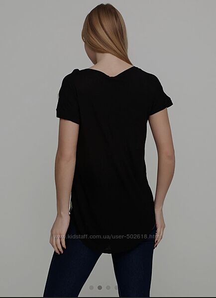футболка прямого силуэта из мягкого трикотажа. Изделие с коротким рукавом. Горловина оформлена круглым вырезом. Длина изделия по спинке на размер М: 55 см, пог 46.Размер М на Л тоже отлично.