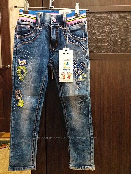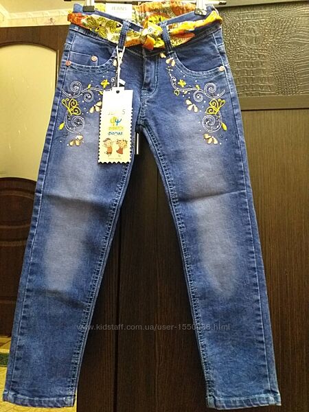 Фото 2-4. Ціна 120 грн.Джинси для дівчинки, нові, р. 21 (приблизно на зріст 110-116 см). Виробництво «Фраєрок та Фіфочка». Колір синій. Декоровані вишивкою та стразами. На блискавці, пояс на гумці. Модель- на худеньку дівчинку.