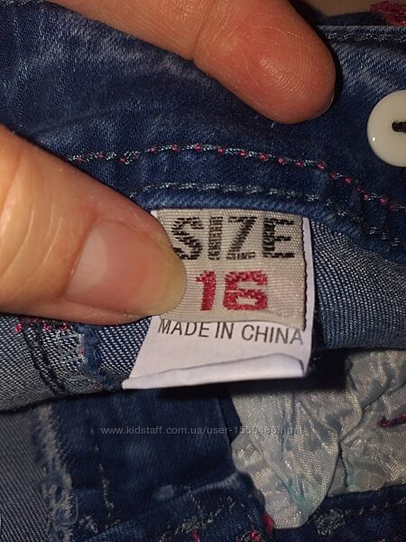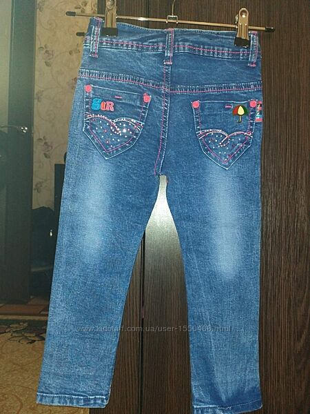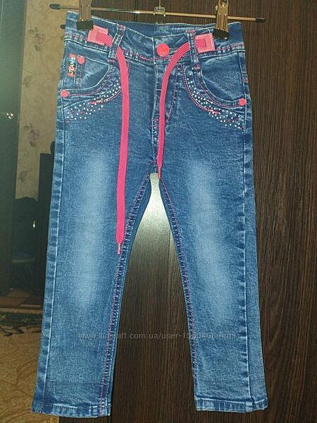 Джинси на дівчинку, р.16 (приблизно на зріст 96-98 см). Виробництво «Фраєрок та Фіфочка». Колір синій. Додатково у талії можна підтягнути шнурком. Декоровані стразами. Бірка є, але її зняли, можу докласти (хотіли носити, дитина походила по кімнаті, але була ще в памперсі і вони у нас з попи сповзають , носить не стали).