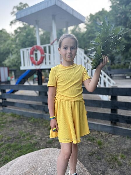 Комплект для девочки в рубчик, футболка-топ и шорты-юбка, Р. 116-134