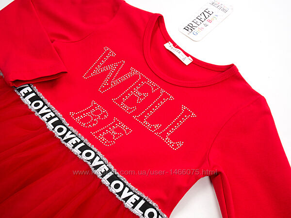 Відмінна трикотажна сукня «WELL BE».Сукня гарного насиченого червоного кольору, з м´якою повітряною фатиновою спідницею, красиво прикрашена на грудях ефектним написом «WELL BE» з переливчастих страз - відмінний наряд для будь-якого святкового виходу Вашої юної модниці.