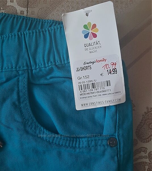 Котоновые шорты-бермуды немецкого бренда Yigga рост 152, не худому. Привезены из Германии. Приталенный крой. Мягкий и приятный на ощупь котон. Пояс на кулиске. резинка 2 кармана по бокам, 2 кармана сзади, 2 на бедрах. 100%, хлопок. Новые, с этикеткой. Длина-56 см, шаговый-29, глубина посадки 25/35, ширина по попе-52, п/о бедра 29, п\о талии в спокойном состоянии 36 см, тянется до 45 см. Стоили 15 евро.Джинсовые шорты-бермуды для мальчиков французского бренда Okaïdi рост 152. Лучше будут на 146-152. Привезены из Германии. Приталенный крой. Мягкий и приятный на ощупь деним. Ребристый эластичный пояс на кулиске. 2 кармана по бокам, 2 кармана сзади. Контрастные швы. Состав 72% котон, 28% полиэстер. БУ, в состоянии новой вещи., без признаков нОски. Длина-55 см, шаговый-30, глубина посадки 23/30, ширина по попе-47, п/о бедра 25, п\о талии в спокойном состоянии 35 см, тянется до 45 см. Цена 190 грн. Пересылаю