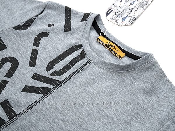 Половина переда футболки украшена контрастным принтом. Горловина обработана мягкой обтачкой из двойного трикотажа.