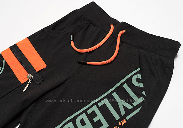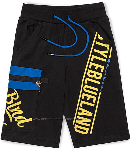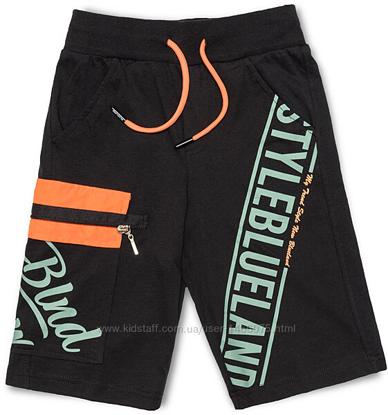 Удлинённые, супер-стильные шорты-бермуды, с удобной посадкой, эластичным поясом на широкой резинке, двумя прорезными карманами и одним боковым накладным карманом с клапаном, обеспечат уют и комфорт при носке. Шорты украшены яркими принтовыми надписями, стильным декором и ярко-синим клапаном, которые прекрасно сочетаются с принтом и декором на футболке, что объединяет эти вещи в стильный и очень модный комплект.