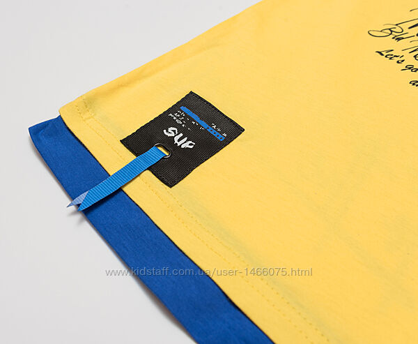 По линии низа ярко-синяя трикотажная широкая вставка, отлично гармонирующая с ярким принтом футболки.