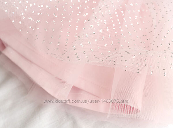 Ефектна, повітряна фатинова спідничка на сріблястій гумці завершує цей класний комплект. Спідниця 3-х шарова: трикотажна основа та м´які, ніжні шари фатину. Верхні із легким, точковим сріблястим напиленням. Спереду пришитий невеликий фірмовий логотип зі стразиками.